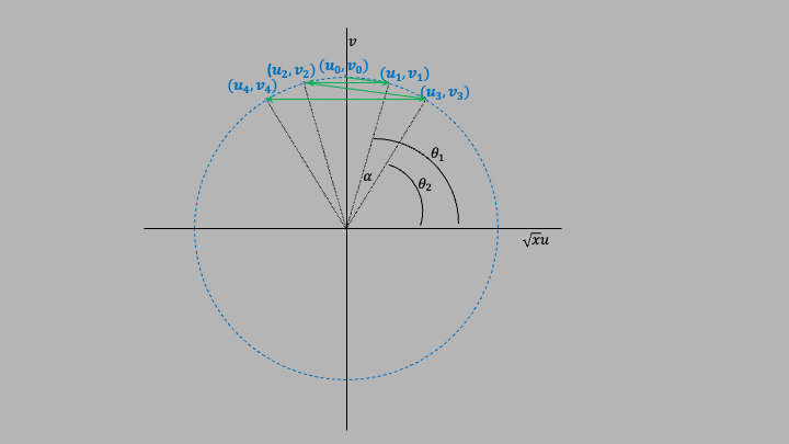 Also shown in the diagram above are the first 2 angles $\theta_1$ and $\theta_2$ that label the coordinates $(u\sqrt{x},v)$, and the angle $\alpha$ between the first 2 $m$-$M$ collisions ($\alpha = \theta_1-\theta_2$). Let's calculate the $\alpha$ angles. First, let $n$ be the $m$-$M$ collisions. The index $k$ runs from 1 to the final number of collisions, $N$, so there will be half as many $n$ values as $k$ values. Each $n$ will correspond to the odd values for $k$, and we can construct the formula for $u_{n+1}$ and $v_{n+1}$ using equations $\ref{equa}$ and $\ref{eqva}$ using the fact that inbetween successive $n$ values, $v$ stays the same but $u$ reverses sign: $$\begin{align} u_{n+1} &= \frac{2v_n+bu_n}{a}\label{equn}\\ v_{n+1} &= \frac{bv_n-2xu_n}{a}\label{eqvn}\\ \end{align}\nonumber$$ Now we are ready to calculate the $\alpha$ angles for all successive $n$ data points using $$\tan\theta=\frac{v}{u\sqrt{x}}\nonumber$$ which means $$\alpha_{n+1}=\theta_n-\theta_{n+1}=\tan^{-1}\frac{v_{n}}{u_{n}\sqrt{x}}-\tan^{-1}\frac{v_{n+1}}{u_{n+1}\sqrt{x}}\nonumber$$ We can simplify using the identity $$\tan^{-1}a - \tan^{-1}b=\tan^-1\frac{a-b}{1+ab}\nonumber$$ which gives $$\tan\alpha_{n+1}=\frac {\frac{v_{n}}{u_{n}\sqrt{x}}-\frac{v_{n+1}}{u_{n+1}\sqrt{x}}} {1+\frac{v_{n}}{u_{n}\sqrt{x}}\frac{v_{n+1}}{u_{n+1}\sqrt{x}}}\nonumber$$ which after some algebra simplifes to $$\tan\alpha_{n+1}=\sqrt{x}\frac{v_nu_{n+1}-u_nv_{n+1}}{v_nv_{n+1}+xu_nu_{n+1}}\nonumber$$ Next we subtitute for $u_{n+1}$ and $v_{n+1}$ using equation $\ref{equn}$ and $\ref{eqvn}$ and use equation $\ref{eqKE0}$ to get $$\tan\alpha_{n+1} = \frac{2\sqrt{x}}{1-x}$$ This is pretty amazing, because it says