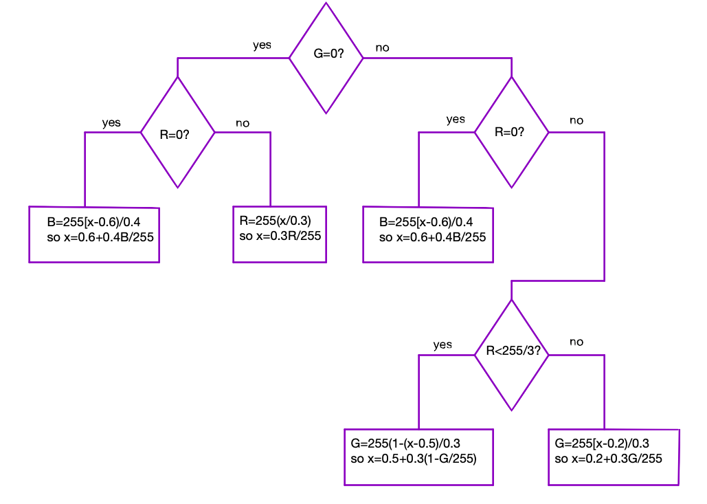 Starting from the top, $G=0?$, this tells us that we are either in region $I$ or region $V-VI$. In region $I$, $R>0$ so if we test on $R=0?$ we will know if we are to the left or right of where $G>0$. If $R=0$, then we are to the right, and the value for $x$ is determined entirely by the value of $B$. If we are to the left, then we use the value of $R$ to determine $x$. If we are in the region where $G>0$, then if $R=0$ we are in region $V$ and again we can use the value for $B$ to determine $x$. If $R>0$ then we are either in region $II$-$III$ where $G$ is increasing, or region $IV$ where $G$ is decreasing, but either way all we need to know if the value for $G$ to determine $x$. Voila. The canvas below shows the color scheme as $x$ increases bottom to top. Click on a color and it will show you the corresponding value of $x$.