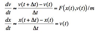 .We now have two first order equations in two unknowns (x and v) and we can apply the Euler approach to generate a stepping rule.