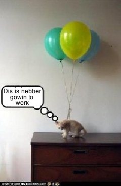 |  | In the Disney-Pixar movie Up, a disgruntled and bored old man attaches a large number of helium balloons to his house and floats away to have some adventures. This is shown in a clip from the movie's trailer at the left. It's fairly difficult to see whether this is plausible by estimating the weight of a house -- and one would have to figure out whether the house had the structural strength to be able to be lifted from one point on the roof without breaking apart. So let's do a simpler problem. Estimate how many helium balloons of the indicated size in the figure at the right* would be needed to lift the kitten. You can take the density of air to be ~ 1 kg/m3 and the density of helium to be about 1/7 that of air when both are at STP. Do you need to worry about the weight of the balloons? * From http://icanhascheezburger.com |  |