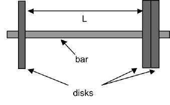 | (a) A weightlifter wants to lift 75 pounds with one hand, but he only has a light (but strong) aluminum bar and three steel disks weighing 25 pounds each. He can set them up as in the figure, but then he finds that they are unbalanced if he tries to lift the bar holding it in the middle. Where should he hold the bar so that the weights are balanced? Assume you can ignore the weight of the aluminum bar and that the steel disks are thin compared to the distance L between them. Explain your reasoning |  |