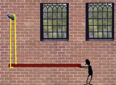 | While walking by your friend’s dorm, she calls to you saying her door is stuck and she’s locked in but she needs to get out and get to class for her physics exam. You suggest she climb out the window, but the bottom of the window is too high up from the ground and she is afraid to jump. You note that there is a work site nearby with some rope and boards. You suggest that you can hook a loop of rope off a convenient gargoyle on one side of her window, put one end of a board in the loop, and hold the other end up for her. You could hold it about half wayup so she could lower herself down in two steps safely. This arrangement is sketched at the right. She is heavier than you and you know you can’t hold up her weight by yourself. Estimate how long a board you need in order to be able to hold her up without dropping her. (The picture is drawn only to show the arrangement. The length of the board shown has not been adjusted to be appropriate.) |  |