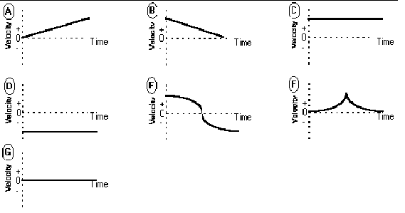 An object's motion is restricted to one dimension along the + distance axis. Select the velocity graph that is the best choice to describe each answer. You may use a graph more than once or not at all. Which graph shows (a) an object going away from the origin at a steady velocity? (b) an object moving toward the origin at a steady velocity? (c) an object standing still? (d) an object changing direction? (e)an object that is steadily increasing its speed?