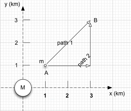A rocket is taken from a point A near an asteroid to another point B. We will consider two (unrealistic) paths labelled path 1 and path 2 as shown in the figure. Calculate the work done by the asteroid on the rocket on each path. Use the full form of Newton's Universal law of gravitation (not the flat-earth approximation "mg"). Calculate the work done by using the fundamental definition of the work