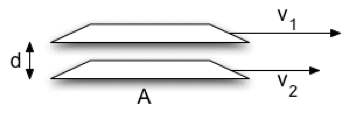 When we were considering the kind of resistance a fluid can exert on an object moving in it, we considered the force linear in velocity, the viscous force. In fluid flow, the viscosity is a kind of internal friction. If we consider two neighboring sheets of fluid (don’t worry too much about how to define this precisely) moving with different velocities as in the figure at the right, then each sheet will exert a force on the other of magnitude