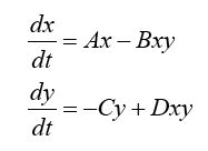 is referred to as the Lotka-Volterra equation and is supposed to represent the evolution of the populations of a predator and its prey as a function of time. (A, B, C, D are positive constants.)