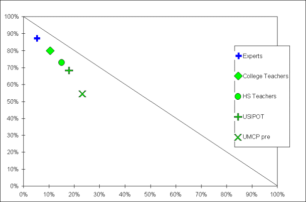 The US International Physics Olympics Team (USIPOT) is a group of high school students selected from applicants throughout the USA. After a two week training session, five are chosen to represent the US in the International Physics Olympics. In 1995 and 1996, this group trained at the University of Maryland in College Park and we took the opportunity to have them complete survey forms. The total number of respondents in this group is N=56. Although they are not teachers, they have been selected by experts as some of the best high school physics students in the nation. Our hypothesis was that they would prove to be more expert than the average university physics student, but not as expert as our groups of experienced instructors.
