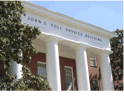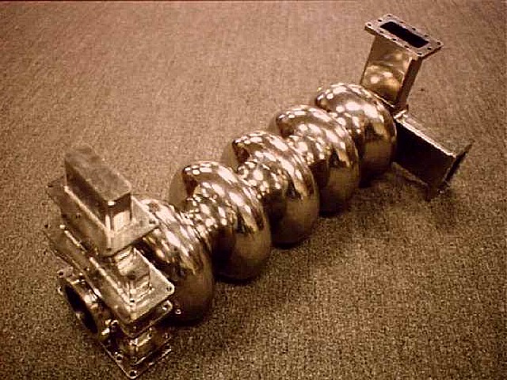 This picture shows a microwave cavity used to accelerate relativistic electrons at the Thomas Jefferson National Accelerator Facility. These niobium superconducting cavities are about a half meter in length and raise the energy of an electron by about 3 million volts per transit. The electron beam passes through two accelerating sections, each containing 160 cavities, as many as 5 times. Thus, beams with more than 5 billion volts can be delivered to experimental halls for research in nuclear physics. The UMd experimental nuclear physics group conducts much of its research at Jefferson Lab. |