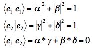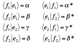 (a) If we choose to describe these 4 vectors as Dirac states, |fi>, i = 1,2 and |ei>, i = 1,2, find the 8 inner products <ei|fi> and <fi|ei>.