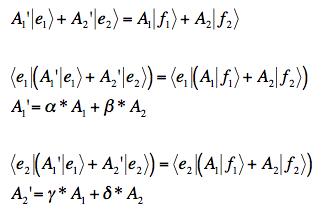 (c) We equate the two sums since they represent the same vector. Dotting it with <e1| picks out A1' and gives an equation for it. Similarly, dotting with <e2| picks out A2' and gives an equation for it. The results are: