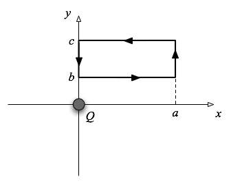 Consider the situation in which a charge Q is at the orgin of our coordinate system in 2D. We wish to calculate the electrostatic potential around the loop shown in the figure at the right. Write the loop integral