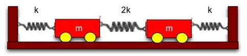 | Two identical wheeled carts of mass m are connected between two walls as shown in the figure below. The two outer springs have spring constants k and the inner spring has spring constant 2k. All three springs have a rest length l0 and the distance between the walls is L. |