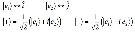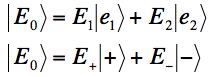 (d) We can consider two distinct bases for the linear space of these 2-D E fields, {|e1>, |e2>} and {|+>, |->}, where: