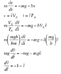 (e) We begin by replacing the dimensioned variables, v and t by their dimensionless counterparts. We then express the natural velocity and time in terms of the problems parameters and simplify. In the end, all the parameters cancel out and we are left with a dimensionless equation.
