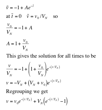 We can see that this solution makes sense. Initially, at t = 0, the exponentials become 1, so the first term is just v0 and the second term vanishes. As time gets large, the exponentials become 0, so the first term vanishes and the second term becomes -VN, the natural (=terminal) velocity in the downward direction. Notice this happens whether you throw the object up initially (v0 > 0), down initially (v0 < 0), or just drop it (v0 = 0).