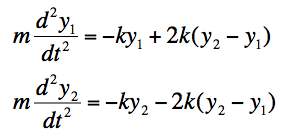 We can check the signs by considering what happens if y1 is positive and y2 is 0. Then the force from the first spring (spring constant k) on mass 1 should be in the negative direction as should the force on mass 1 from the second spring (spring constant 2k). These are both correct. The force on mass 2 should from the second spring should be in the positive direction and the force from the third spring (spring constant k) should be 0. This is correct. If y1 is 0 and y2 is positive, the force on the first mass from the first spring should be 0 and from the second spring should be positive. (Correct) The force on the second mass should be negative from the second spring (correct) and negative from the third spring (correct).