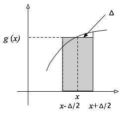 (b) If we divide the x range into N equal bins, the bins will have the size Δ = (b - a)/N. We want the area of the curve by adding up the area in each of the Delta bins. A decent approximation is to take the area of the bin as the width of the bin (Δ) times the average height of the bin, taken as the value of g evaluated at the mid-point of the bin. This is shown in the figure at the right with the center of the bin being represented as x. For our bins, the center of the bin will be at x = a+nΔ + Δ/2. This gives the desired result. |