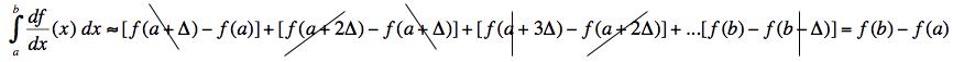 All the terms cancel except the end terms (the vertical bar cancellations in the expression below indicates a cancellation with the next or previous (unshown) term) giving the fundamental theorem of calculus.