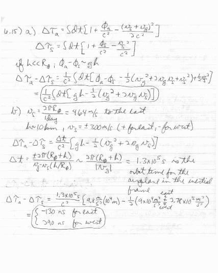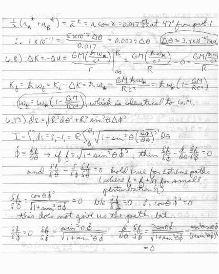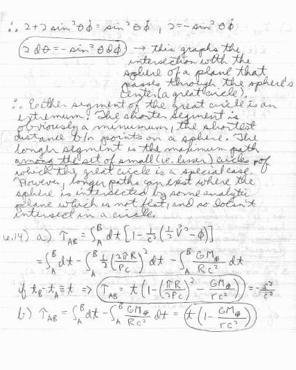 Remark on 6.12, first part: The problem does not ask you to show dI = 0 to first order (where I is the space "interval", i.e., the length of the curve) -- it tells you great circles are geodesics. You are to show that the specified curve is the shortest, not some other kind of extremum. The usual calculus procedure is to look at second derivatives. In the present case we can show it more generally. Without loss of generality we may assume a unit sphere and that the two given points are on the great circle