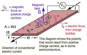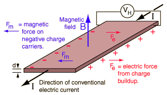Hall EffectIf an electric current flows through a conductor in a magnetic field, the magnetic field exerts a transverse force on the moving charge carriers which tends to push them to one side of the conductor. This is most evident in a thin flat conductor as illustrated. A buildup of charge at the sides of the conductors will balance this magnetic influence, producing a measurable voltage between the two sides of the conductor. The presence of this measurable transverse voltage is called the Hall effect after E. H. Hall who discovered it in 1879. Note that the direction of the current I in the diagram is that of conventional current, so that the motion of electrons is in the opposite direction. That further confuses all the "right-hand rule" manipulations you have to go through to get the direction of the forces.