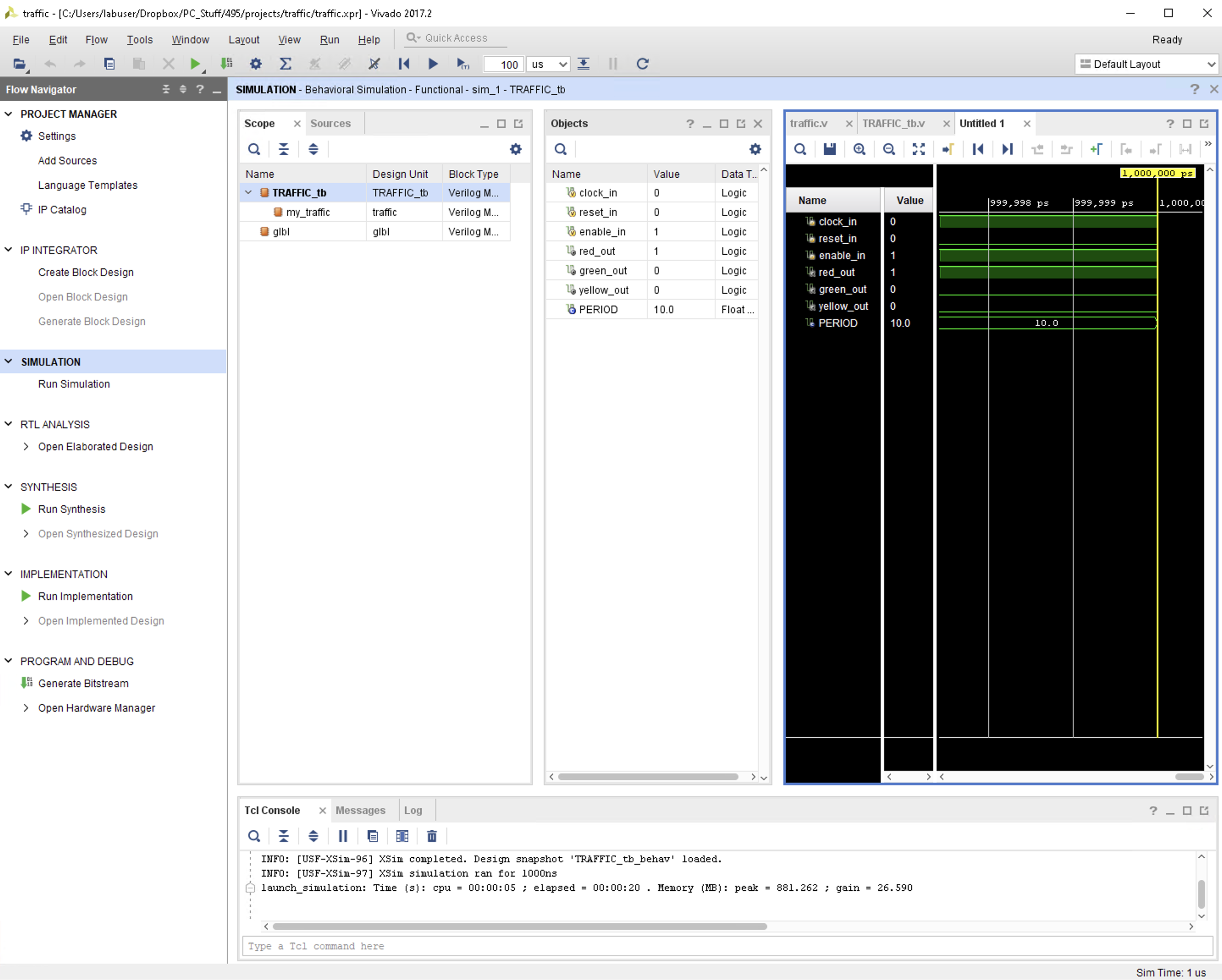 Note: TRAFFIC_tb is driving inputs into traffic, and looking at outputs,