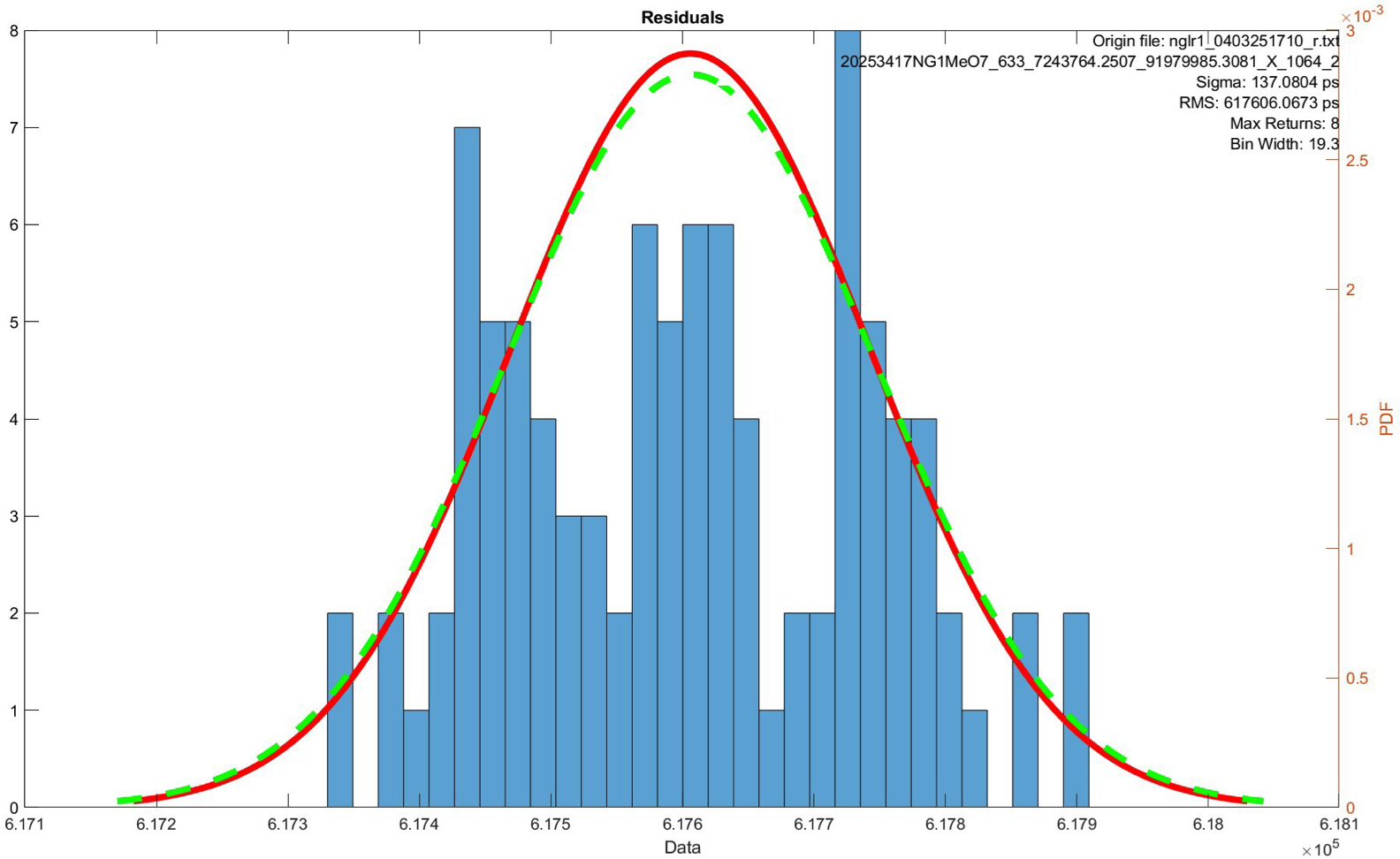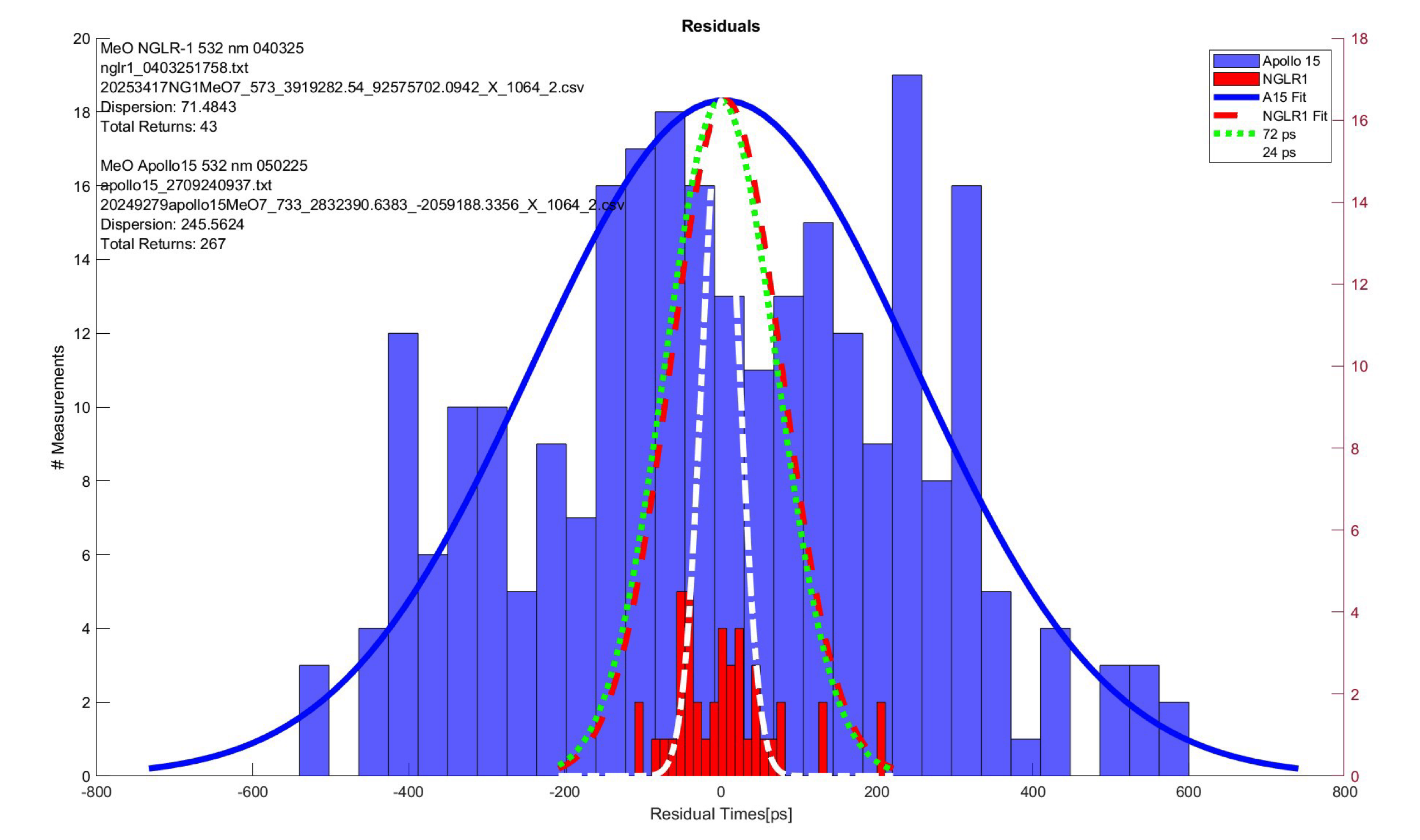 (LLR) return residuals. The dispersion supported by NGLR-1 is much less than the dispersion involved in the hardware systems currently used by the various LLROs. Figure 1 is from the initial LLR results of MeO at Grasse, France, illustrating the dispersion, or spread in LLR residual magnitudes, of their March 4th observations, using the green laser at 532 nm (red curve). It compares the observations with the dispersion of the data from their local calibration CCR (green curve). This comparison illustrates that the dispersion of the NGLR-1 returns almost exactly matches the dispersion from the calibration CCR. This illustrates that NGLR-1 is supporting the minimum dispersion that can be obtained with the MeO green LLR system. Figure 2, again from the initial March 4th results of MeO, compares the dispersion of the LLR residuals using the infrared laser at 1064 nm (red curve) with the dispersion of the data from the local calibration CCR (green curve). This again illustrates that the dispersion of the NGLR-1 residuals almost exactly matchs the best dispersion that can be obtained with the MeO infrared LLR system. The very small dispersion that the NGLR-1 supports means that as the dispersion of the LLROs improves over the decades, NGLR-1 will continue to support their improvement. For the Apollo retroreflector arrays, the contribution of the LLROs went from ~75 mm to a few mm over the past 50 years.
