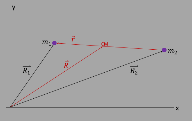If we then plug these definitions into the definition for the vector $\vec{R}$ that points to the CM (equation $\ref{evecRR}$), we get the nice relation: $$M\vec{R}=m_1\vec{R_1}+m_2\vec{R_2}=m_1(\vec{R}+\vec{r_1})+m_2(\vec{R}+\vec{r_2}) = (m_1+m_2)\vec{R}+[m_1\vec{r_1}+m_2\vec{r_2}]=M\vec{R}+[m_1\vec{r_1}+m_2\vec{r_2}]$$ which can only be true if $$m_1\vec{r_1}+m_2\vec{r_2}=0\label{ercmcm}$$