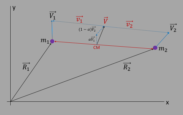 Given that we now know how to describe the position of the CM, and the position of the satellites relative to the CM, we can now describe the velocities of the two satellites in a similar way. Starting with the diagram in figure 7 and the two velocities of the satellites relative to the origin, $\vec{V_1}$ and $\vec{V_2}$, we can form the analogous CM velocity analogous to equation $\ref{evecRR}$ via $$\vec{V} = \frac{m_1\vec{V_1} + m_2\vec{V_2}}{m_1+m_2}\label{evecVV}$$ and the relative velocities via: $$\vec{V_1}=\vec{V}+\vec{v_1}\label{ev1cm2}$$ $$\vec{V_2}=\vec{V}+\vec{v_2}\label{ev2cm2}$$ This is actually the same thing as considering the CM momentum, where we can define $P=MV=p_1+p_2$. Figure 7 shows how just like with the position vectors, the velocity vectors will add such that the CM velocity will lie on the vector $\vec{v}\equiv \vec{V_1} - \vec{V_2}$.