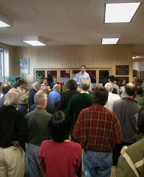 The Department hosted a special tea on November 21, 2003 to celebrate 50 years of afternoon tea here at Maryland Physics. Every day during the semester, the Department hosts afternoon tea in the lobby of the Physics building. Eighty-five cents will buy you a cup of coffee or tea as well as hands full of snacks. This program, initiated by Dr. Toll in 1953, is a great opportunity for faculty, students and staff to take an afternoon break and enjoy both social and scientific discussion with their colleagues.