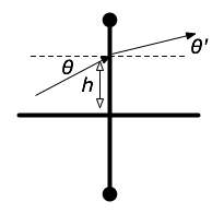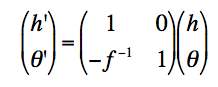 The value of this representation appears when we consider how we can represent the propagation of the ray or to bending by a lens. In the small angle approximation (where sin θ ≈ θ), these actions can be described in terms of this two component vector ( h, θ) as the action of matrices as seen in the figures below.