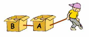 Little Nathan’s dad has hooked together two boxes with ropes to make a train for him as shown in the picture. Nathan has put one of his twin sisters in each box and is pulling them along the rug as shown. (a) If Nathan is pulling on the rope with a constant force T, draw free body diagrams for each of the boxes, identify all the forces on it, being sure to specify the kind of force each one is and what object is exerting it. |