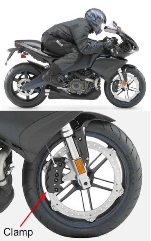 Two students have just finished analyzing the forces on a passenger and the parts of an accelerating automobile. But in this problem they treated the car and the wheels as a single object. Snooki says, “But if we were stopping we would have to consider the brakes.” Ronnie knows that his motorbike has disc brakes. A clamp, when open, allows the wheel to spin freely through it. But when he brakes, the clamp squeezes tightly together and creates a strong frictional force of the clamp on the wheel. He says, “I think we can work it out how the bike stops.” Let’s help them fill in their reasoning. A. Consider the motorbike (= “the rest of the bike not including the clamp or wheel”), the clamp, and the wheel. While the brake is being squeezed to slow down the bike, draw a system schema and free body diagrams for the horizontal and vertical forces on the clamp and on the wheel. Be sure to label each force with the type of force it is, what is causing the force and what is feeling the force. Only show the forces in the plane of the wheel. (Don’t bother showing the forces perpendicular to that plane such as e.g. the normal forces the clamp exerts on the wheel.) |