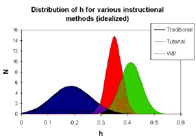 | Fig. 4: (a) Histogram of FCI gains in traditional and tutorial classes at the University of Maryland. (b) Gaussian fit to histogram of FCI gains in traditional, tutorial, and WP classes at 8 institutions. It is clear that student performance is better after going through research-based learning environments than it is after going through traditional learning environments. |