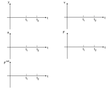 | Students in a school rocketry club have prepared a two stage rocket. The rocket has two small engines. The first will fire for a time, getting the rocket up part ways. Then the first stage engine drops off revealing a second engine. After a little time, that engine will fire and take the rocket up even higher. The rocket starts firing its engines at a time t = 0. From that instant, it begins to move upwards with a constant acceleration. This continues until a time t1. The rocket drops the first stage and continues upward briefly until a time t2 at which point the second stage begins to fire and the rocket again accelerates upward, this time with a larger (but again constant) acceleration. Sometime during this second period of acceleration, our recording apparatus stops. On the graphs below, sketch qualitatively accurate (i.e., we don't care about the values but we do about the shape) graphs of each of the height of the rocket, y, its velocity, v, its acceleration, a, the force on the rocket that results from the firing of the engine, F, and the net force on the rocket, Fnet. Take the positive direction as upward. |