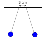| Two hard rubber spheres of mass ~ 10 g are rubbed vigorously with fur on a dry day. They are then suspended from a rod with two insulating strings. They are observed to hang at equilibrium as shown in the figure on the right, which is drawn approximately to scale. Estimate the amount of charge that is found on each sphere. | ![]() |