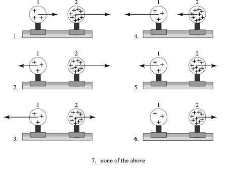 Two uniformly charged spheres are firmly fastened to and electrically insulated from frictionless pucks on an air table.The charge on sphere 2 is three times the charge on sphere 1. Which force diagram correctly shows the magnitude and direction of the electrostatic forces? Explain your reasoning.