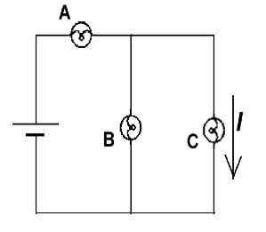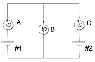 b. An electrical circuit is connected as shown in the figure on the right. It contains two identical batteries. The battery labeled #1is rated at 6 Volts and the one labeled #2 is rated at 3 Volts. The 3 bulbs (labeled A, B, and C) are identical and, at the currents in the circuit, each bulb can be taken to have almost a constant resistance of 3 Ohms. Use Kirchoff's laws to find: