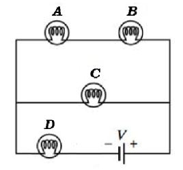 a. Rank the order of brightness of the bulbs. Explain your reasoning. (Use a ranking such as E>F=G>H=0, that is, only use greater than signs, indicate if any two situations produce equal brightness, and indicate if any of the bulbs are totally out.) b. If bulb D is removed from its socket, how does the brightness of each of the bulbs A, B, and C change? Explain your reasoning. c. If bulb D is put back in its socket and bulb C is removed, rank the brightness of bulbs A, B, and D. |