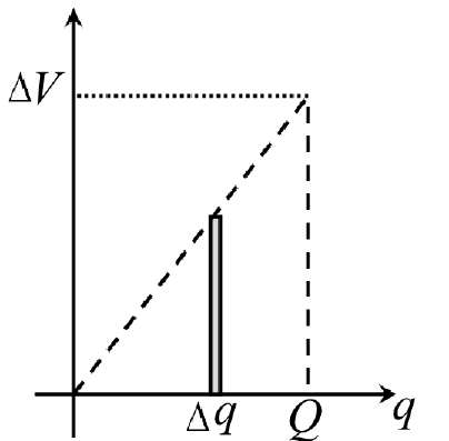 A capacitor stores a separation of charge. Since to separate the charges on a capacitor, you have to move charges against where the E field wants to push them, charging takes work. That work becomes stored energy -- just like carrying water up a hill so that you can let it roll down at a later time and turn a generator. A. Suppose the charges on the capacitor plates are equal to + q and - q . How much work does it take to carry a small positive charge Δq from the negative plate to the positive one, thereby increasing the charge on the plates? B. If you start with no charge on the plates and start to carry small charges over a bit at a time, the total charge Q will increase. Since the potential difference is proportional to the charge on each plate, the graph of the potential difference vs. the amount of charge on the plate will be a straight line, as shown by the dotted line on the graph at the right. From the geometry of this figure, find an expression for the total amount of work it takes to charge the plates up to a value of + Q, -Q |