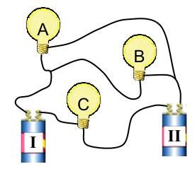 In the figure at the right is shown a circuit with two identical batteries and three identical resistors (bulbs). The batteries are shown so that the anode (positive terminal) is on the right of each battery. If one of these batteries were to be directly connected to one of these bulbs, it would light the bulb brightly. For the following items, select the item that best completes the sentence and enter it in your answer sheet. If more than one answer is correct, give them all. Briefly explain your answers. |