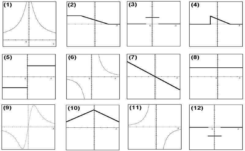 Below are shown some graphs, some of which might represent a graph of either the electrostatic potential or the x-component of the electric field at the locations along that axis in the various cases. Fill in the table below by identifying which graphs would work for each case. If more than one would work, give all that are correct. If none work, put N. |