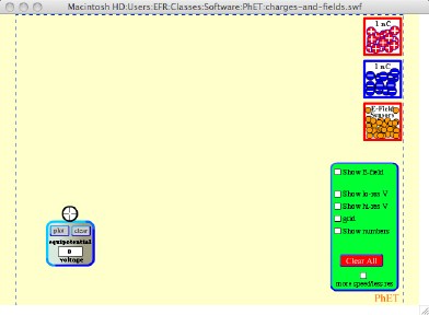 You can also use the potential meter (shown at the lower left of the screen above) to measure the potential (in Volts) at the point under the cross at the top of the meter. It will also draw the equipotential surface through that point. (At least the part of the surface that interacts the plane that it is showing.)