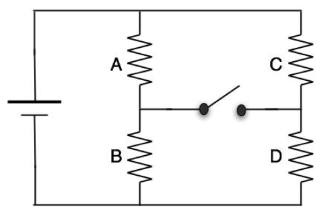 A circuit is shown at the right containing a battery, four resistors, and a switch. The battery yields a potential difference of V0 and the resistors have the following values: RA =RD = R and RB = RC = 3R. (a) When the switch is open, find the current flowing through the battery. Express your answer in terms of the symbols V0 and R. Show your reasoning. (b) When the switch is closed, the current flowing through the battery is I0. Is there any current flowing through the switch? If so, in which direction and how much? You may express your answer as a fraction of I0 or in terms of V0 and R. |