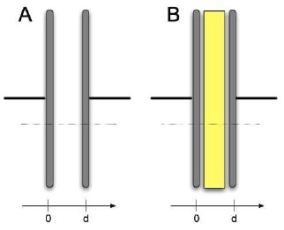 One of the most important current problems in converting to "green energy" is storage. Lots of renewable energy resources – solar, wind – are intermittent and the times they are available don’t necessarily match when the energy is needed. One method of storage uses batteries but they are inefficient (a lot of the energy is lost) and expensive. An alternative being considered is the capacitor. This stores electrical energy in the electric fields between charges. Let's consider how this works and where the energy is. Two capacitors are shown in the figure at the right. In case A, the gap between the plates is air (which can be ignored). In case B, the gap is filled with a plastic insulator with dielectric constant κ (with κ > 1). This means that when both capacitor are charged to the same value Q, the electric field in between the plates in case B is reduced by a factor of κ compared to case A. |