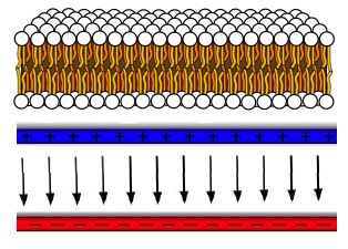 C. An important feature of cellular membranes is that there is an electrical potential difference across them. A typical membrane in an animal cell maintains a potential difference of 70 mV across the membrane. Many membranes are made up of pairs of lipid molecules lined up as shown in the top figure at the right, with their hydophilic ends (small spheres) on the outside and their hydrophobic ends (tails) on the inside. Let's make a simple model of the charge distribution on the membrane that leads to the indicated potential difference. We'll approximate it as two parallel flat sheets of uniform charge with a constant field between them. The thickness of the membrane is about 5 nm. |
