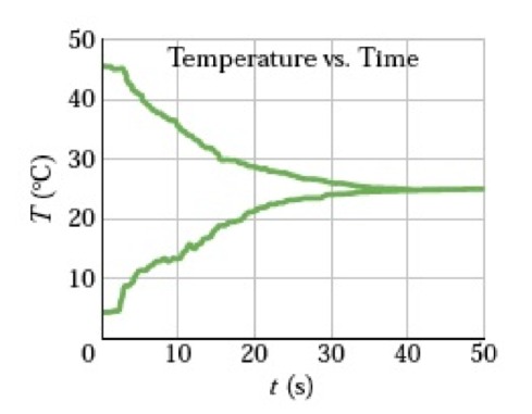 You were sick the day of the lab on heat and temperature and you asked you lab partner to explain to you what she had done. She opened her folder and pulled out the graph shown at the right. She said, “We used these temperature probes hooked to the computer. We put them in two beakers with liquids in them and mixed them together. We did this with a number of different liquids. One was always 100 cc of water. We started the computer and then poured the liquid from one beaker into the other and put both temperature probes into the beaker with the liquid and stirred them up. We then continued to take data for about a minute.” A. If the second beaker contained water, what must have been the mass of water in the beaker? Explain your reasoning. A. If the second beaker contained water, what must have been the mass of water in the beaker? Explain your reasoning. B. Your lab partner say, “Wait. I don’t think this graph is for water. I remember the stuff in the second beaker smelled funny. It could have been carbon tet (CCl4).” If the second beaker did hold carbon tetrachloride, as she suggests, how much liquid must have been in that beaker? (The specific heat of water is 4184 J/kg-C and for CCl4 it is 866 J/kg-C.) C. She doesn't remember whether the hot beaker contained the water or the CCl4. Does it matter? If so find the answer for the other arrangement than you considered in B. If it does not, explain why not. |
