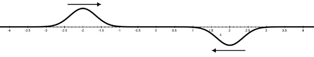 Two pulses are started on a stretched string. An upward pulse is started on the right that moves to the left. At the same instant, a downward pulse is started on the left that moves to the right. At t = 0 their peaks are separated by a distance of 4 cm as shown below. The pulses move on the string with a speed 200 cm/s.