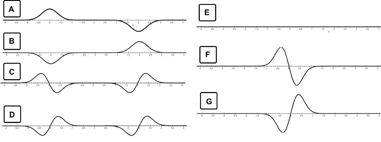 The figure below shows somegraphs that could represent properties of these pulses on the string. The vertical scales in the graphs are arbitrary and not necessarily the same. The horizontal scales all represent positions on the string (x).