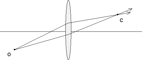 In the figure shown below, point O is a source of light. Two rays from O are shown passing through a thin converging lens and crossing each other at the point marked C.