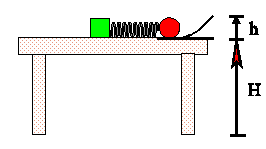 - The spring constant = 32 N/m, the spring's compression is 5 cm, the ball's mass is 20 grams, the height of the ramp is 10 cm, and the top of the table is 1 m above the floor. With what speed will the ball hit the floor? (Use g = 10 m/s2).